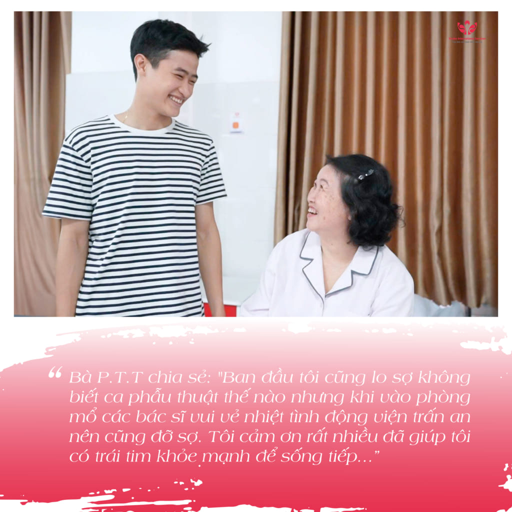 “Trước đó tôi luôn ê ẩm vùng sườn trái, không thể nằm nghiêng bên trái. Sau can thiệp thì tôi thấy nhẹ nhõm, hơi thở dài hơn. Ban đầu cũng lo sợ không biết ca phẫu thuật thế nào nhưng khi vào phòng mổ các bác sĩ vui vẻ nhiệt tình động viện trấn an nên cũng đỡ sợ. Tôi cảm ơn rất nhiều đã giúp tôi có trái tim khỏe mạnh để sống tiếp…”