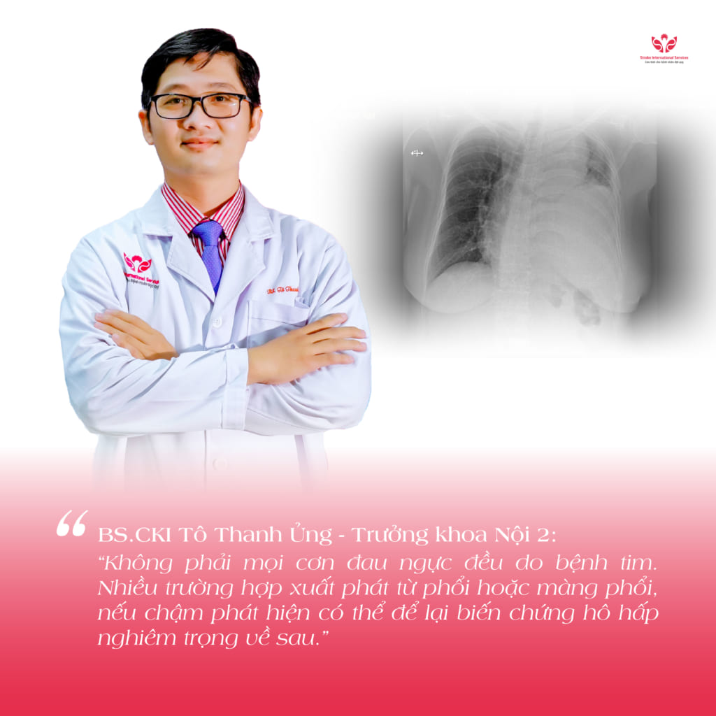 BS.CKI Tô Thanh Ủng – Trưởng khoa Nội 2 (Chuyên khoa Hô hấp) cho biết: “Không phải mọi cơn đau ngực đều do bệnh tim. Nhiều trường hợp xuất phát từ phổi hoặc màng phổi, nếu chậm phát hiện có thể để lại biến chứng hô hấp nghiêm trọng về sau.”