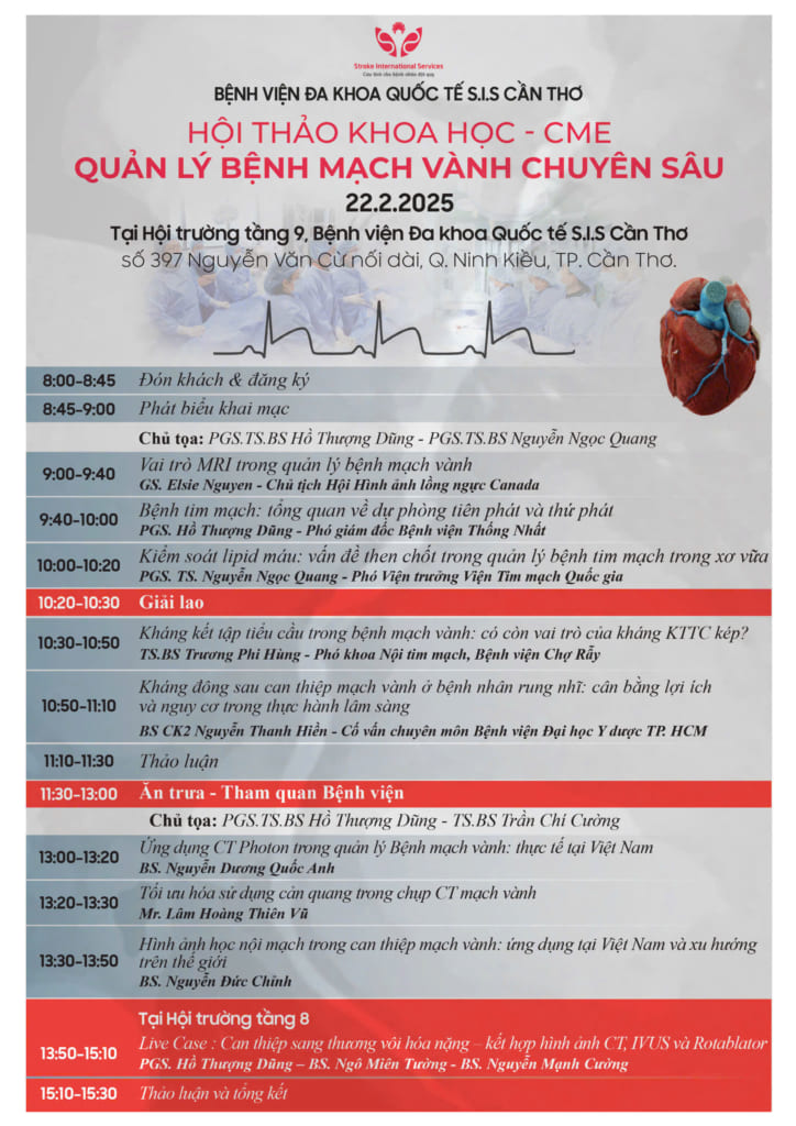 Ngày 22/02, Bệnh viện Đa khoa Quốc tế S.I.S Cần Thơ tổ chức thành công hội thảo khoa học “Quản lý bệnh mạch vành chuyên sâu”. Hội nghị nhằm cập nhật kiến thức mới trong việc chẩn đoán và điều trị bệnh mạch vành bằng công nghệ cao.