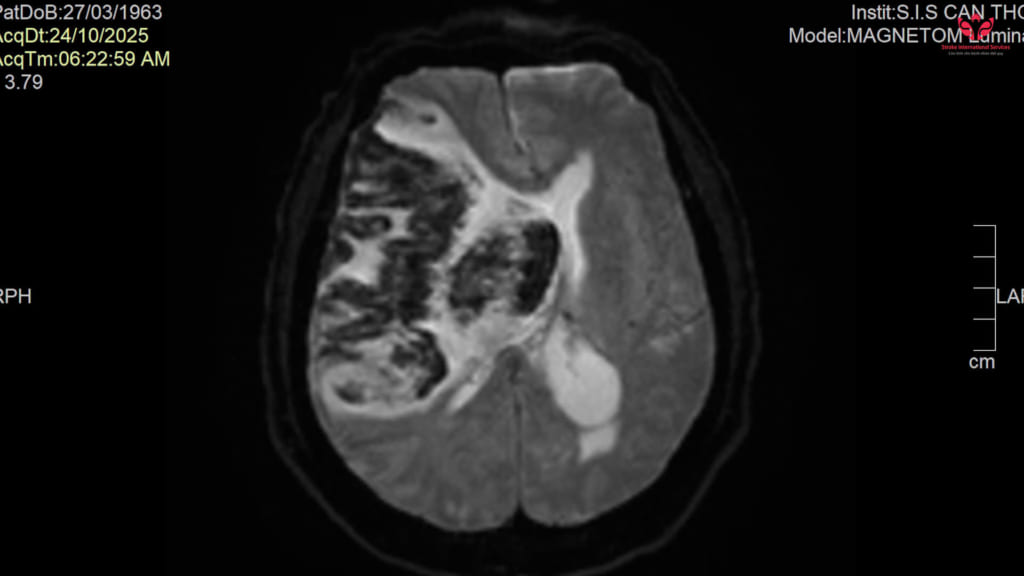 Bệnh nhân N.T.H. (62 tuổi, ngụ phường Khánh Hội, TP.HCM) nhập viện trong tình trạng hôn mê sâu (GCS 4–5 điểm), phải thở máy. Kết quả chụp MRI não cho thấy nhồi máu não diện rộng vùng bán cầu phải chuyển dạng xuất huyết, phù não nặng, kèm nhiều bệnh nền phức tạp như tăng huyết áp, đái tháo đường, rối loạn mỡ máu, bệnh tim thiếu máu cục bộ.