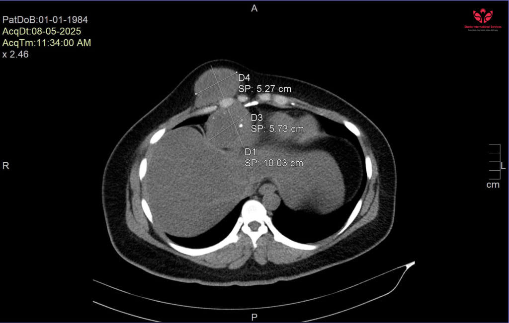 Qua thăm khám lâm sàng và cận lâm sàng, hình ảnh CT scan ghi nhận khối u có đường kính lên đến 11cm, trong đó một phần phát triển ra ngoài, một phần lan sâu vào trung thất, xâm lấn màng tim, màng phổi và xương sườn phải.