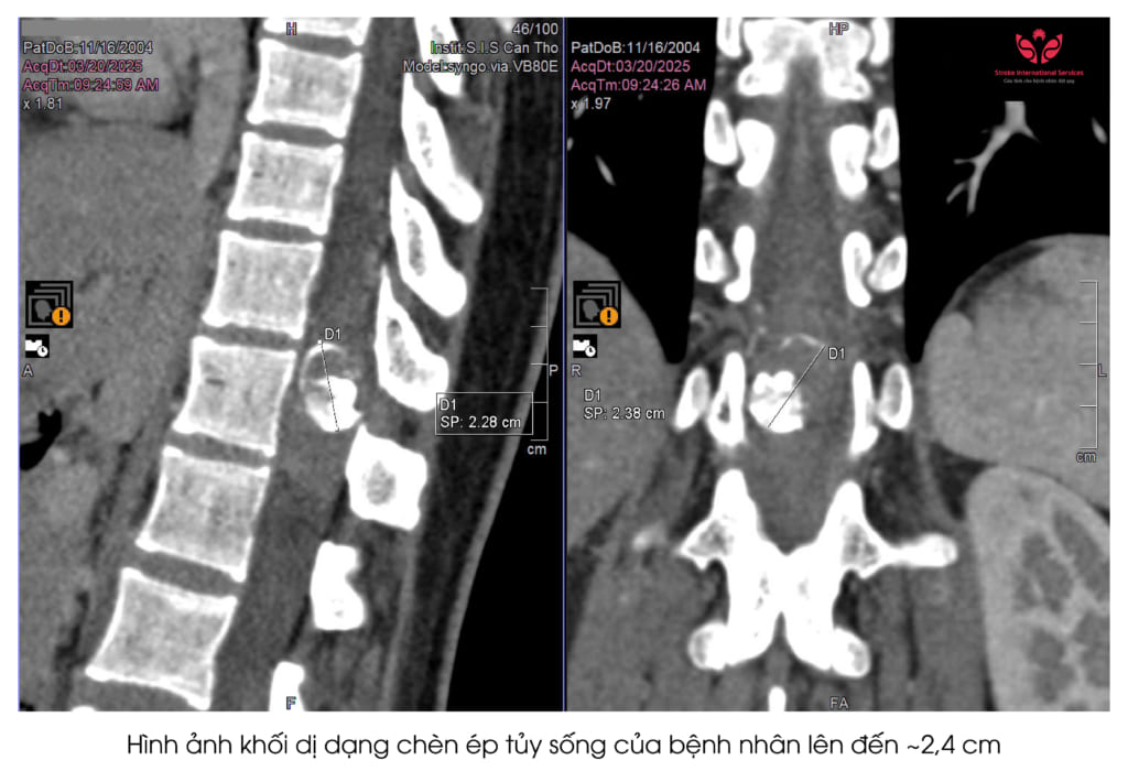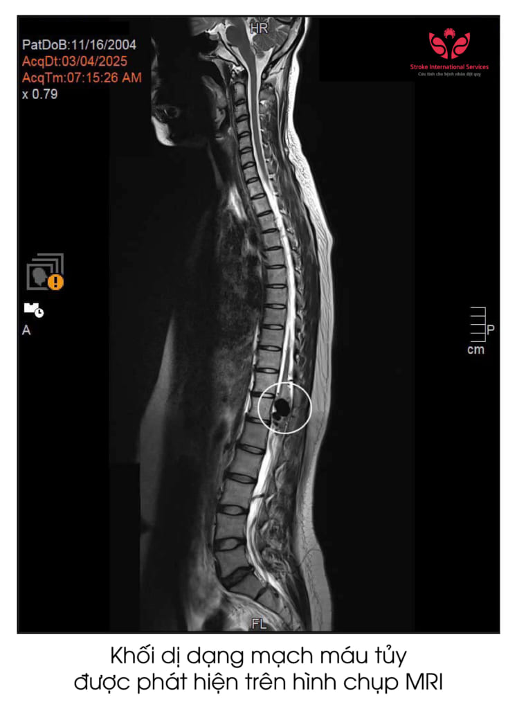 “Khi bệnh nhân đến khám, từ các triệu chứng điển hình các bác sĩ nghi ngờ có dấu hiệu tổn thương hệ thần kinh tủy sống và chỉ định cho bệnh nhân chụp cộng hưởng từ cột sống. Kết quả hình ảnh học cho thấy khối dị dạng lớn ở vùng mạch máu tủy. Khối dị dạng này gây phù tủy, chèn ép rất nặng gây yếu chân. Thông thường đường kính tủy sống khoảng 2 cm. Nhưng túi phình dị dạng có đường kính lên đến 2,4 cm đã chèn ép toàn bộ vùng chóp cùng tủy trong đó có chùm đuôi ngựa.