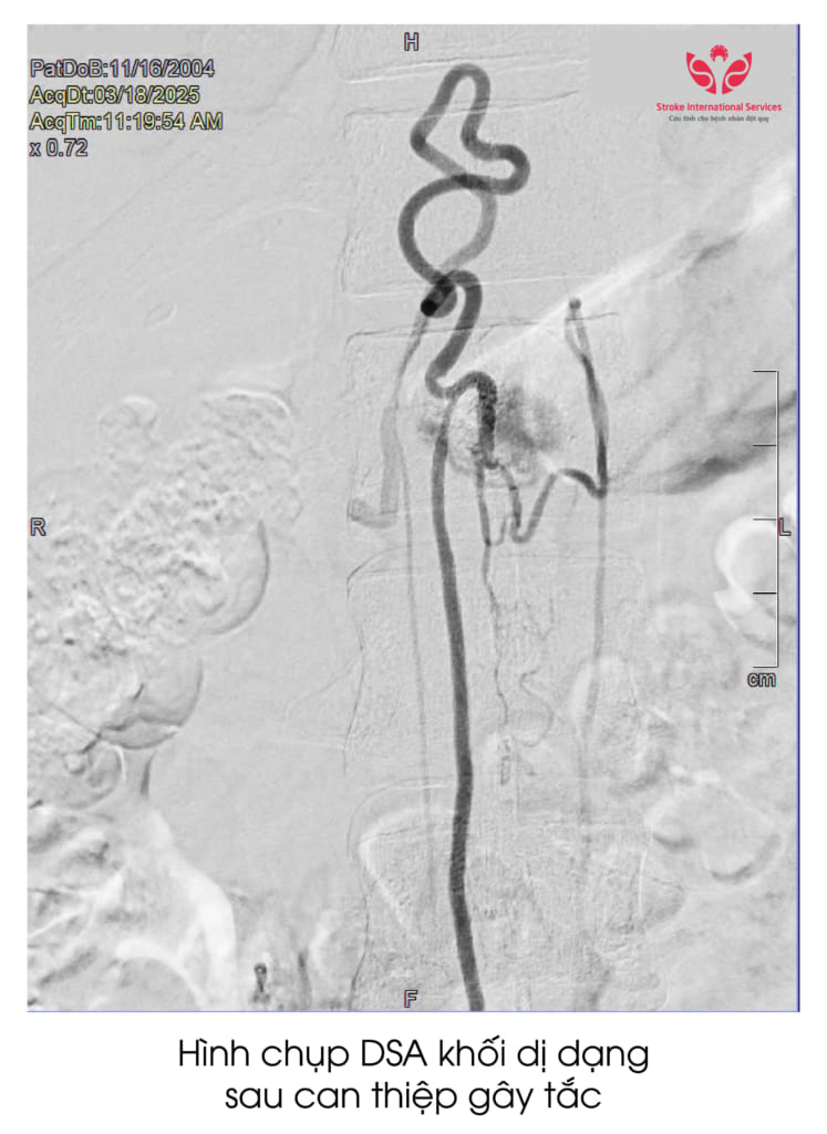 Rất may mắn bệnh nhân đã được tiến hành điều trị kịp thời. Ê kíp bác sĩ đã tiến hành hội chẩn và có chỉ định điều trị can thiệp gây tắc mạch máu. Sau khi gây tắc chỗ thông động tĩnh mạch tủy đã được chữa khỏi hoàn toàn. Túi phình có kích thước rất lớn nên cần phải mổ cắt bỏ hoàn toàn vùng dị dạng. Như vậy mới có cơ hội phục hồi cho bệnh nhân.