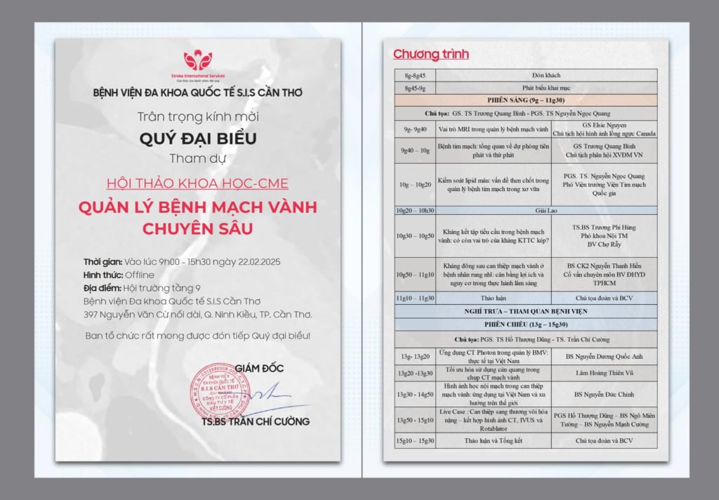 Nhằm nâng cao nhận thức và cập nhật kiến thức chuyên sâu trong việc chẩn đoán và điều trị bệnh mạch vành, đồng thời ứng dụng công nghệ cao để cải thiện chất lượng cuộc sống cho bệnh nhân, Bệnh viện Đa khoa Quốc tế S.I.S Cần Thơ trân trọng tổ chức chương trình “Hội Thảo Khoa Học Quản Lý Bệnh Mạch Vành Chuyên Sâu”.